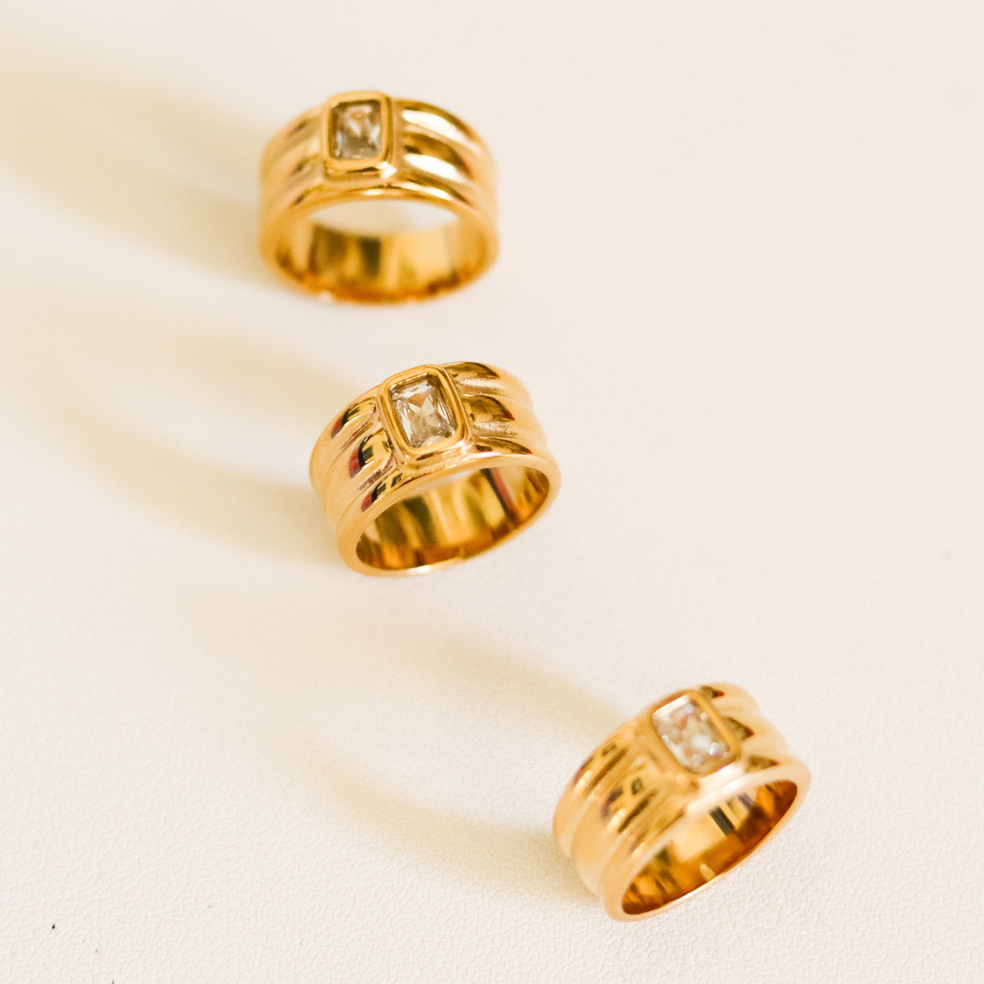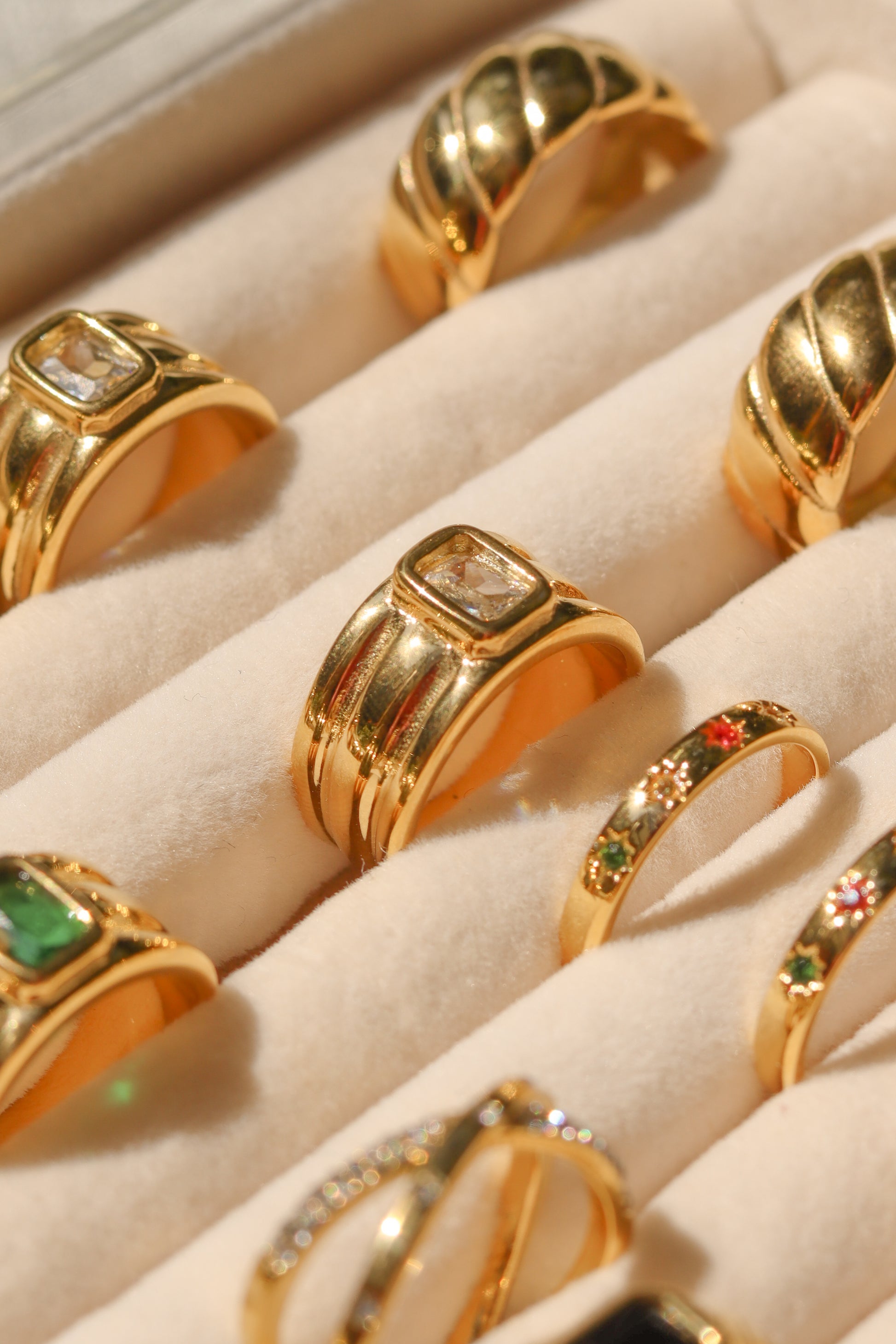 Diseñado con acero inoxidable chapado en oro 18k, el Anillo Kira Bold Blanco es la opción perfecta para un look de lujo moderno. La chapa de oro le otorga un brillo excelente, mientras que la resistencia del acero inoxidable garantiza un uso duradero.