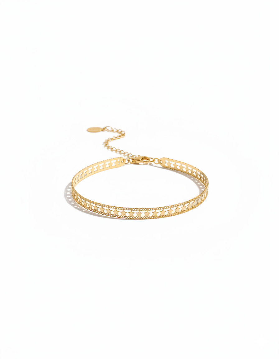 Un delicado choker dorado con detalles de estrellas, inspirado en las noches luminosas del Mediterráneo. Perfecto para realzar tu brillo natural con un toque bohemio y sofisticado.